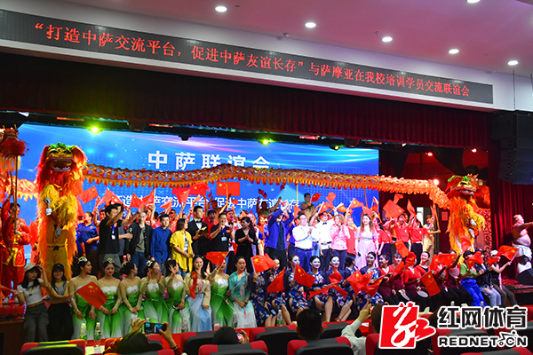 联谊会上,中国味十足的《龙狮贺喜促和谐》表演一开场就赢得了观众阵阵掌声。萨摩亚培训学员为现场师生送上了传统舞蹈表演,激昂的战舞、悠闲的沙滩舞蹈、轻松欢快的岛国群舞,赢得了现场师生连连喝彩。长沙商贸旅游职院学生在丝竹管弦配乐下翩翩起舞,《茶韵中国》将茶艺与舞蹈结合,一展华夏文明和文化的魅力。极具中国特色的川剧变脸和湖南本地花鼓戏《刘海砍樵》,令中萨双方的观众都拍手叫绝。双方学生学员还合唱了2008年北京奥运会主题曲《我和你》以及《天下相亲相爱》两首歌,述说着中萨两国虽相隔万里,但国与国,心连心,为梦想,万里行。