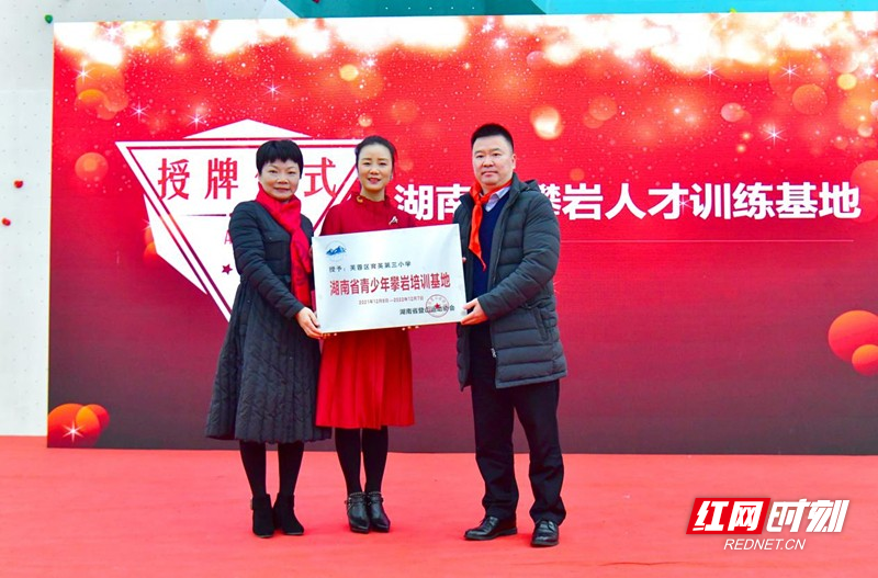 仪式上,湖南省体育局二级巡视员、湖南省体育总会专职副主席兼秘书长王晃致辞,湖南省体操运动管理中心主任李敬为育英三小授牌“湖南省青少年攀岩培训基地”。