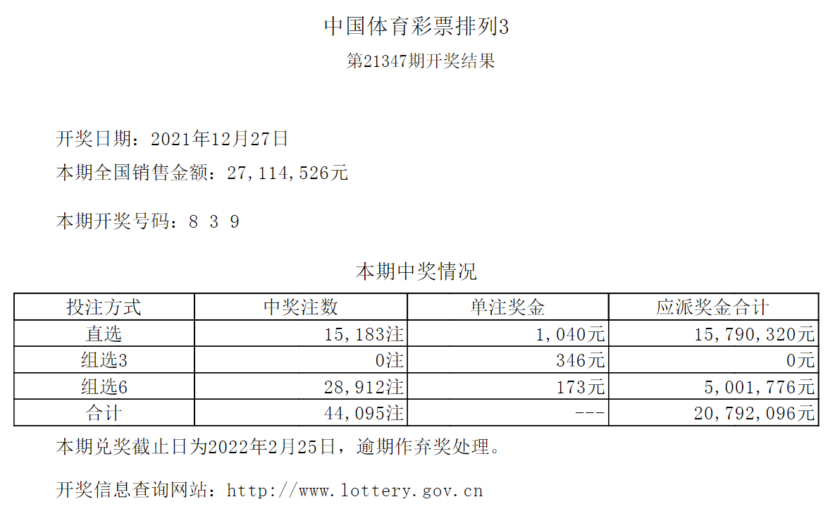 中国体育彩票12月28日开奖信息