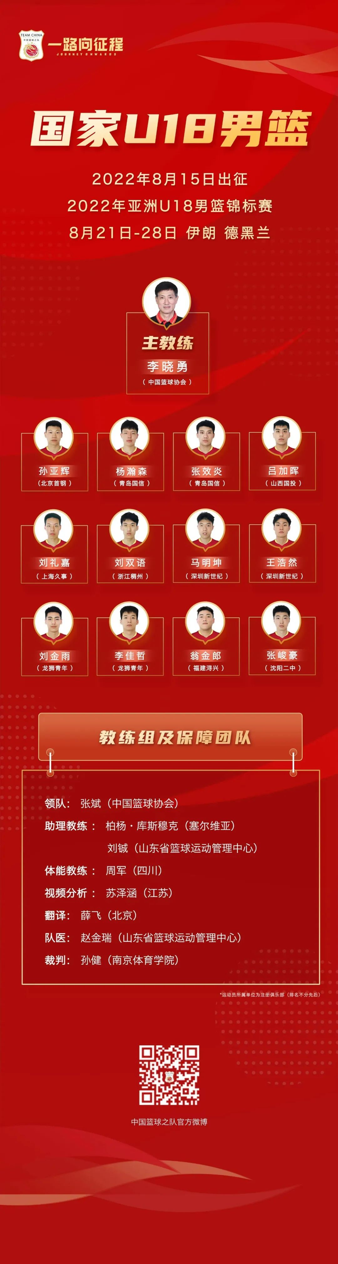 央视网消息:北京时间8月15日,中国U18男篮从广州出发前往伊朗,参加2022年8月21日至28日在德黑兰举行的亚洲U18男篮锦标赛。中国篮球之队公布了U18男篮的12人球员名单: