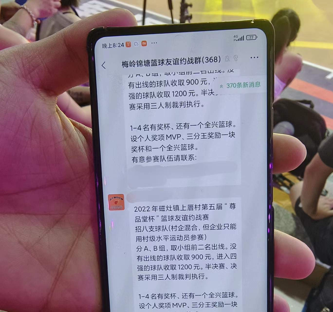 聊到当地篮球赛事究竟有多火爆,魏群超直接掏出手机,名为“梅岭锦塘篮球友谊约战群”的微信群弹出消息,里面刚好是一则篮球赛事的招募信息。