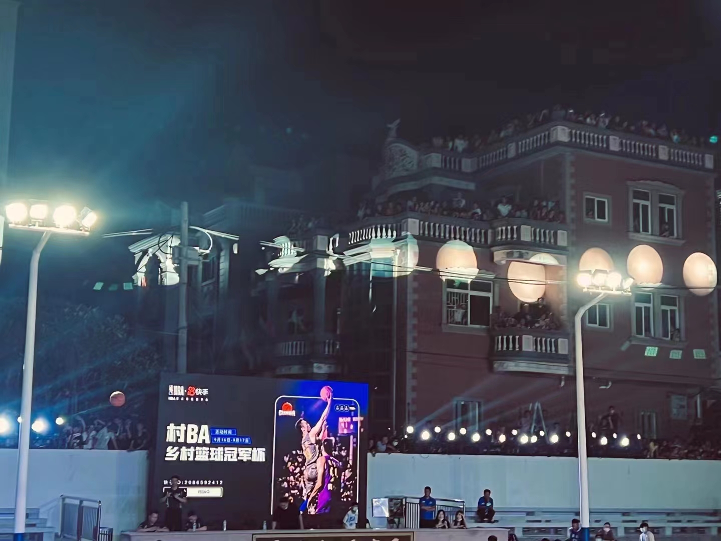 入夜的东店村灯光球场,热闹非凡,球场旁的三层洋楼上早已站满观众。