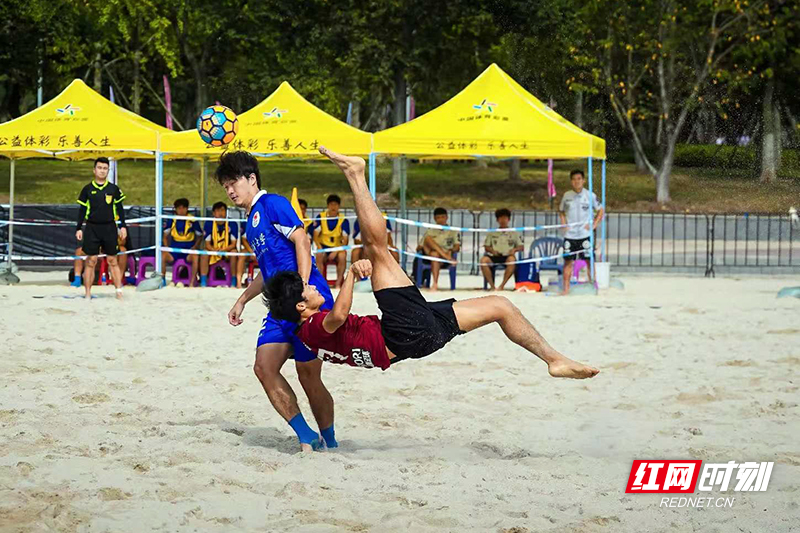 参加沙滩足球比赛时,张涛(红衣)曾多次尝试倒挂金钩射门。供图/受访者
