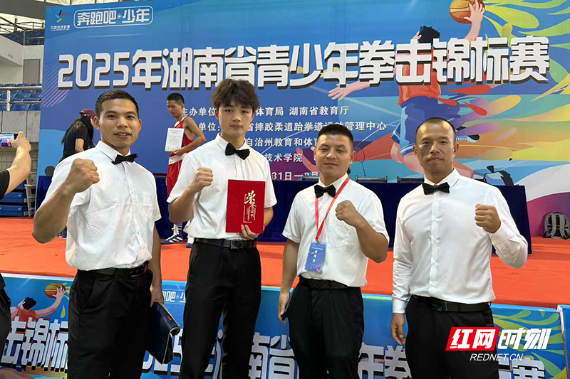 2025年,胡劲(右一)在湘西参与湖南省青少年拳击锦标赛裁判工作。供图/胡劲