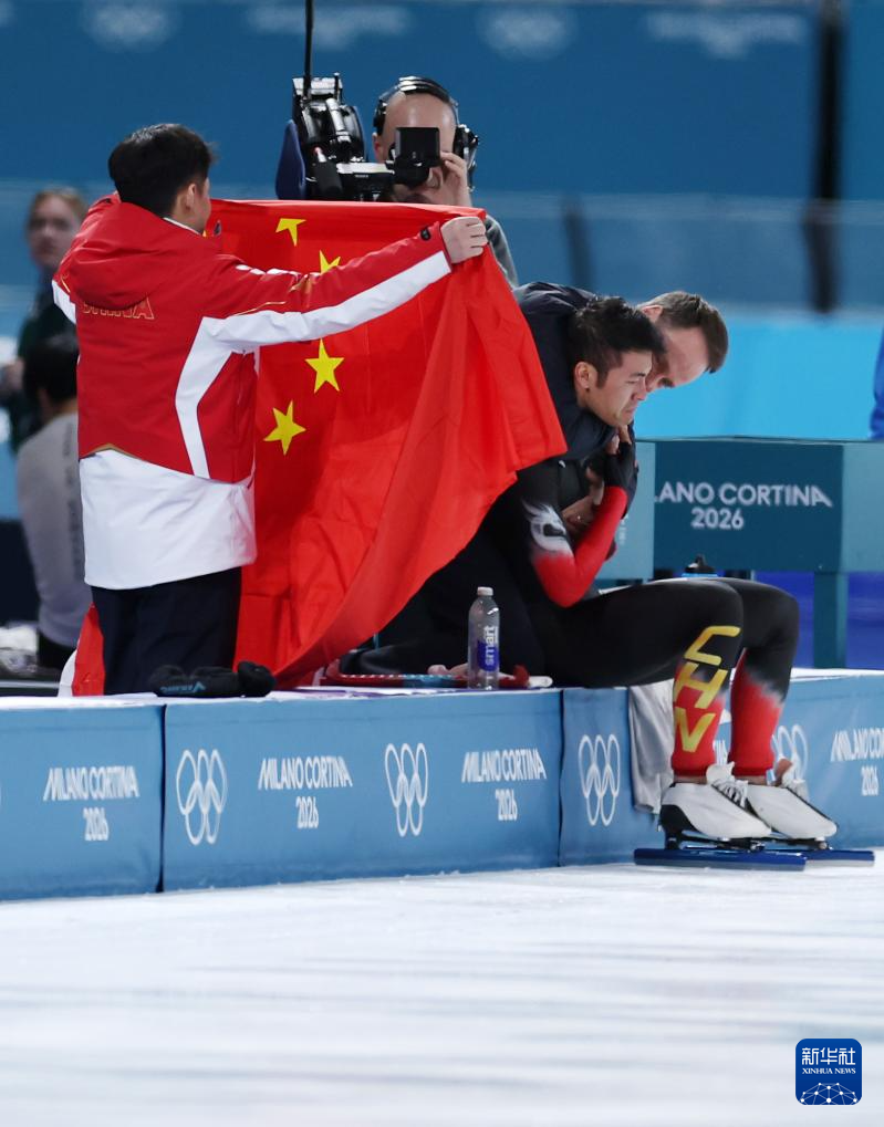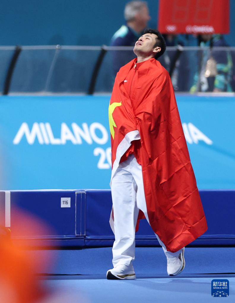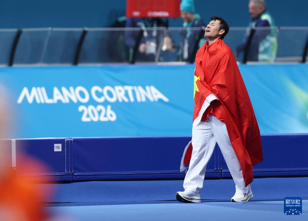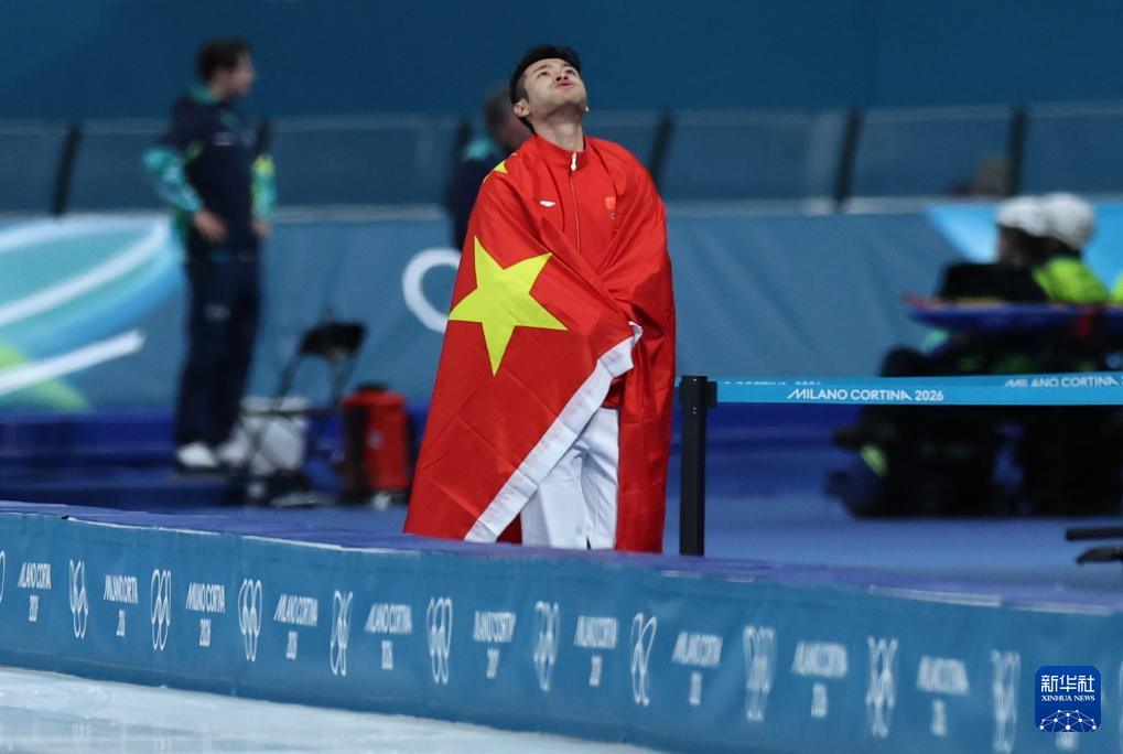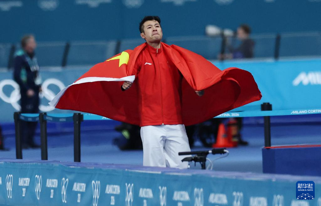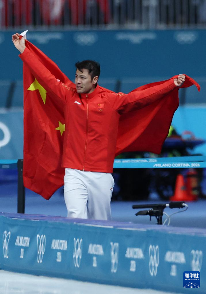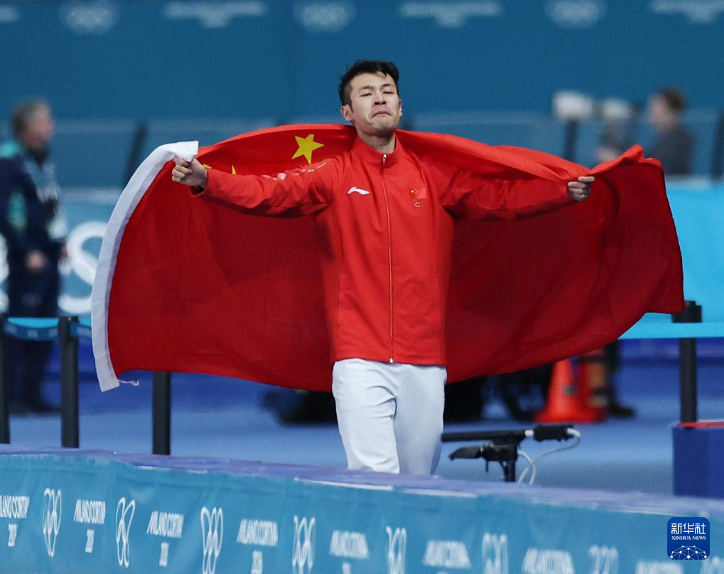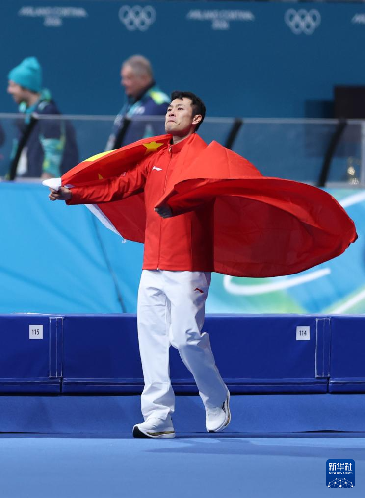 2月11日,宁忠岩在赛后身披国旗庆祝。