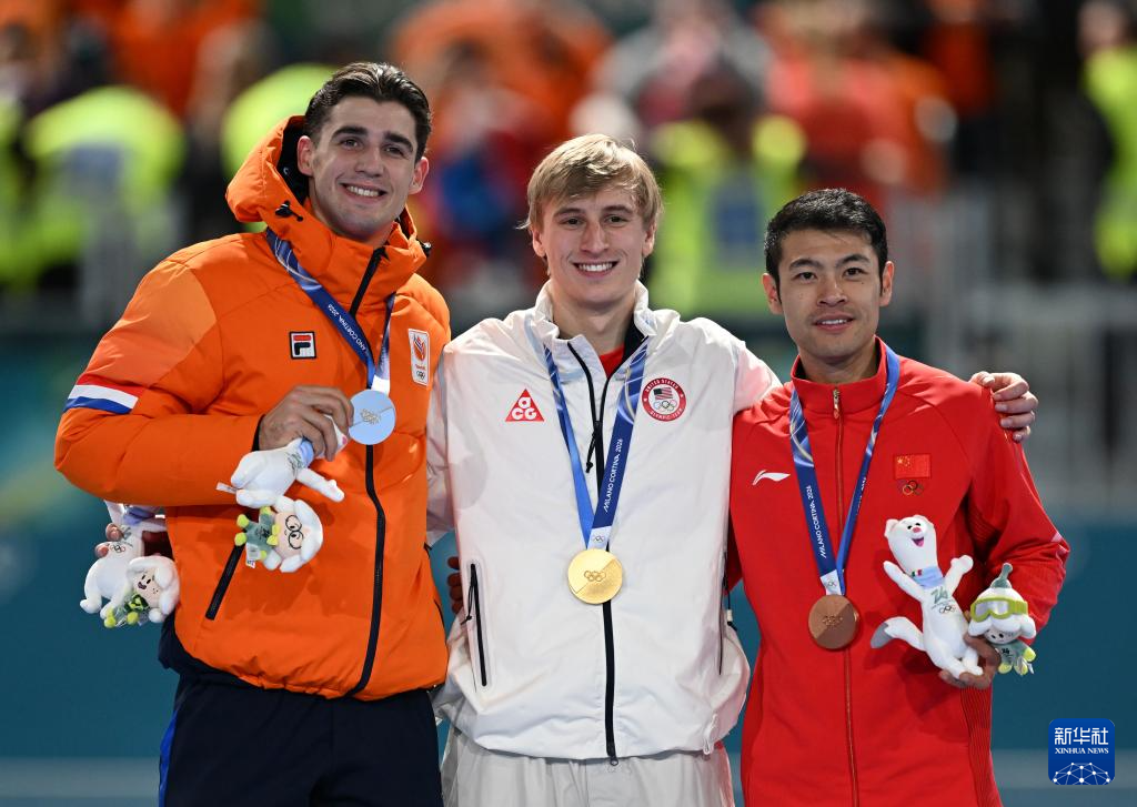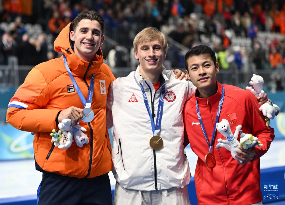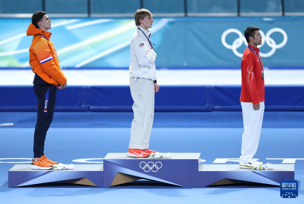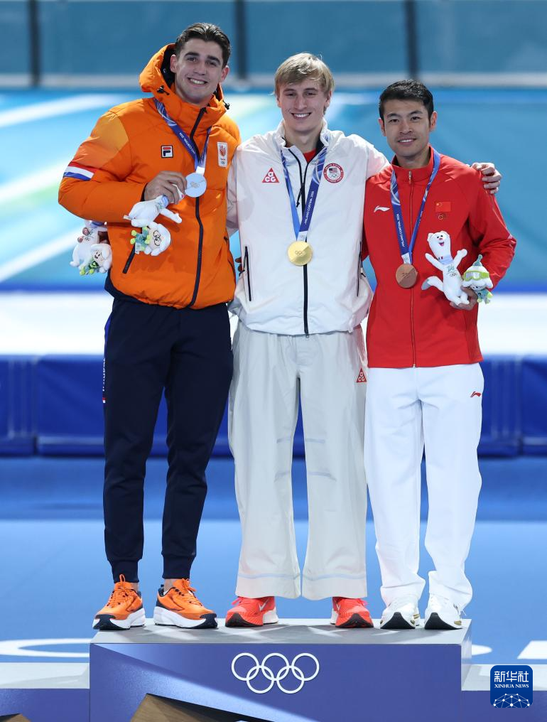 2月11日,冠军美国选手斯托尔兹(中)、亚军荷兰选手德布(左)和季军中国选手宁忠岩在颁奖仪式上。