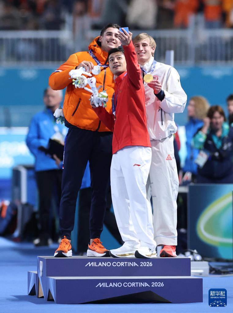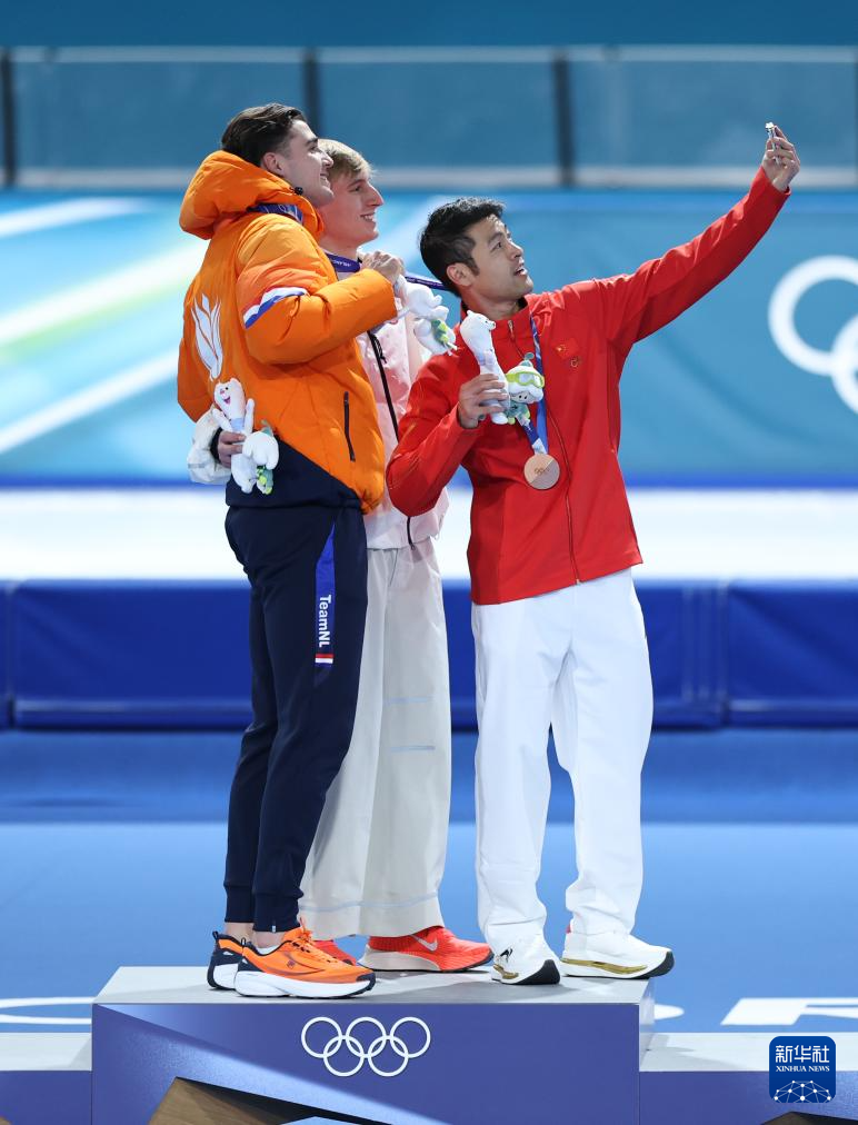 2月11日,冠军美国选手斯托尔兹(中)、亚军荷兰选手德布(左)和季军中国选手宁忠岩在颁奖仪式上自拍。