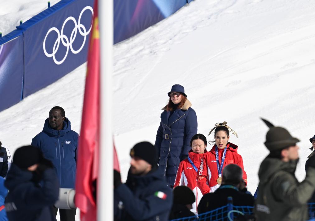 巍峨的雪山之间,两面冉冉升起的五星红旗在白雪蓝天的映衬下更加夺目,在场的上百名中国观众齐声高唱国歌,嘹亮的歌声在利维尼奥山谷回响。