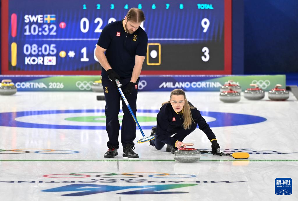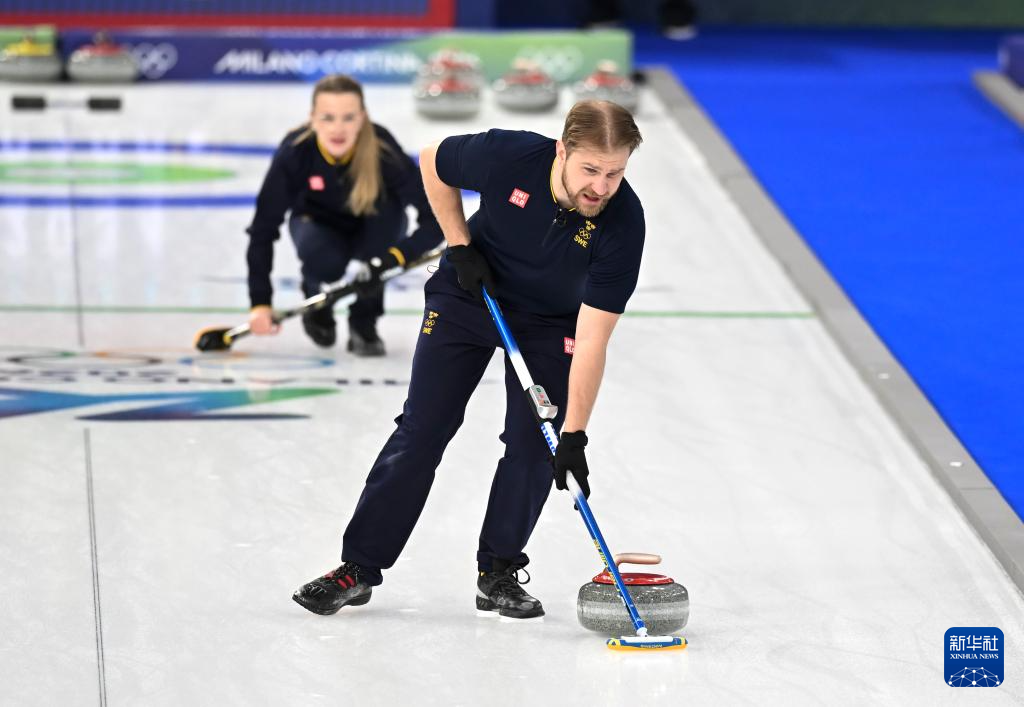 2月4日,瑞典队选手拉斯穆斯·弗拉纳(左)和伊莎贝拉·弗拉纳在对阵韩国队的比赛中。瑞典队10比3战胜韩国队。