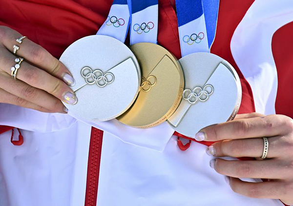 中国队运动员谷爱凌获得的米兰冬奥会奖牌。图/新华社