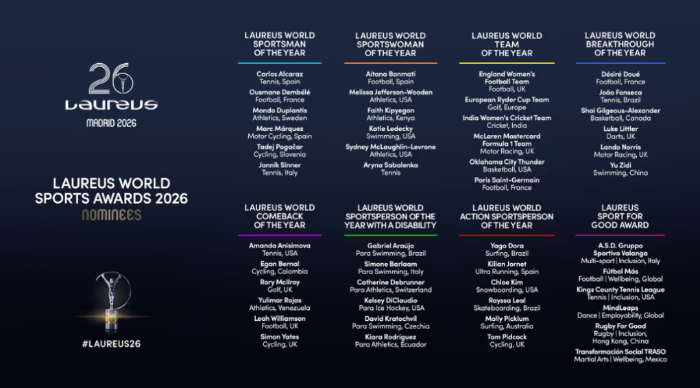 图为本届劳伦斯世界体育奖全部提名名单。图片来自劳伦斯世界体育奖官网