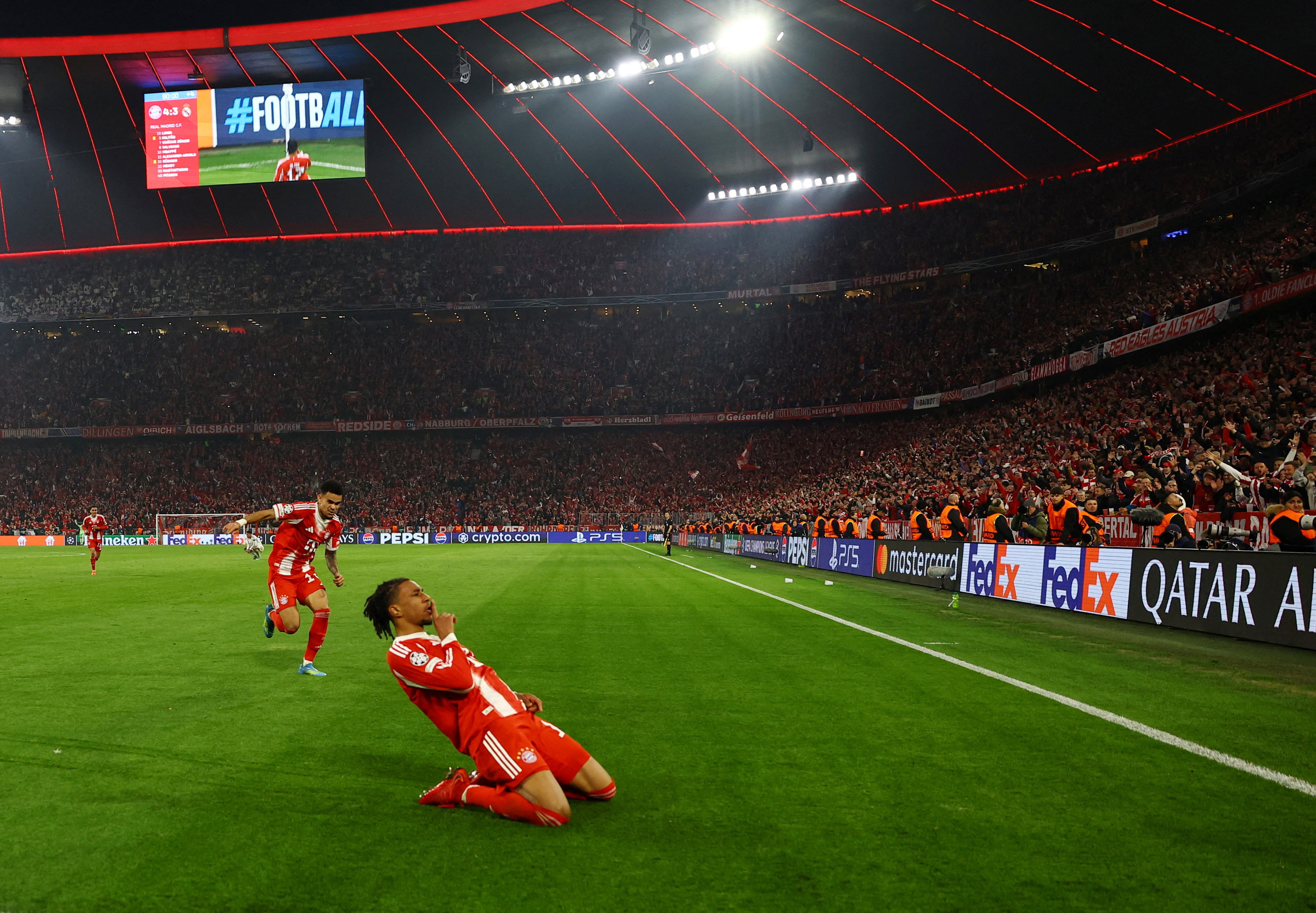 易边再战,拜仁持续施压,皇马阵型回收。诺伊尔化解了姆巴佩的近距离攻门,奥利塞和迪亚斯也先后考验了皇马门将卢宁。比赛尾声出现转折,卡马文加因手球阻止拜仁快速发球,领到第二张黄牌被罚下。拜仁随后把握住人数优势,在第89分钟由迪亚斯禁区外劲射将比分扳为3:3。终场补时阶段,奥利塞攻入制胜球,拜仁晋级半决赛。