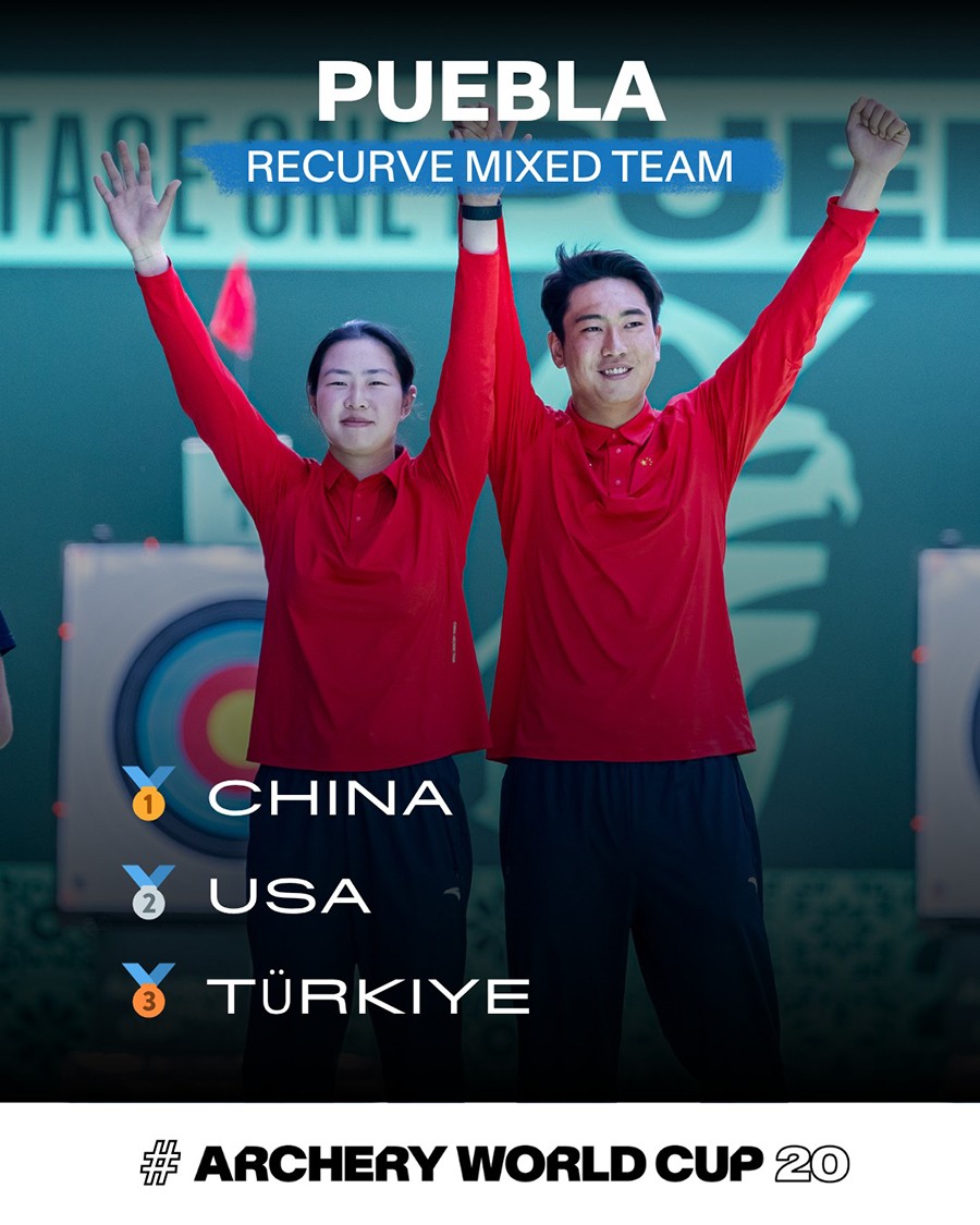 湖南运动员孙景宣(右)携手朱静怡(左)射落射箭世界杯墨西哥普埃布拉站反曲弓混合团体项目金牌。本文供图/中国射箭国家队
