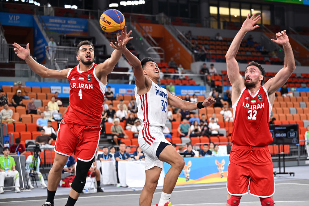 4月27日,伊朗队球员与菲律宾队球员在亚沙会三人篮球比赛中拼抢。新华社记者 郭程 摄