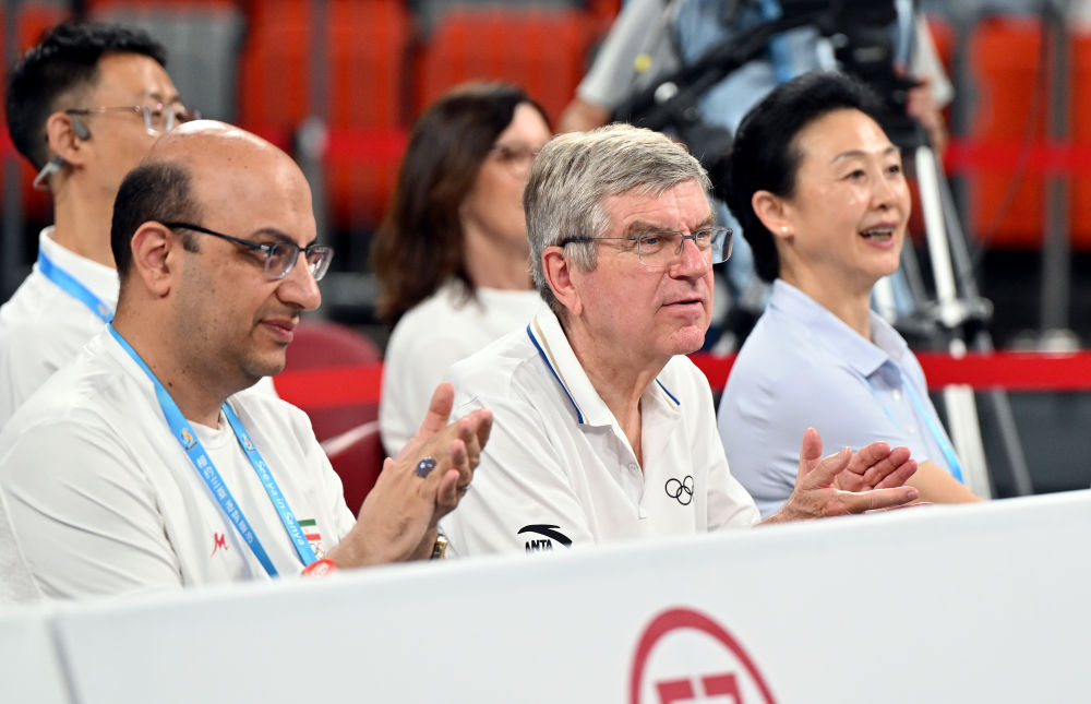 4月25日,国际奥委会终身名誉主席巴赫(中)观看三人篮球比赛。新华社记者 郭程 摄