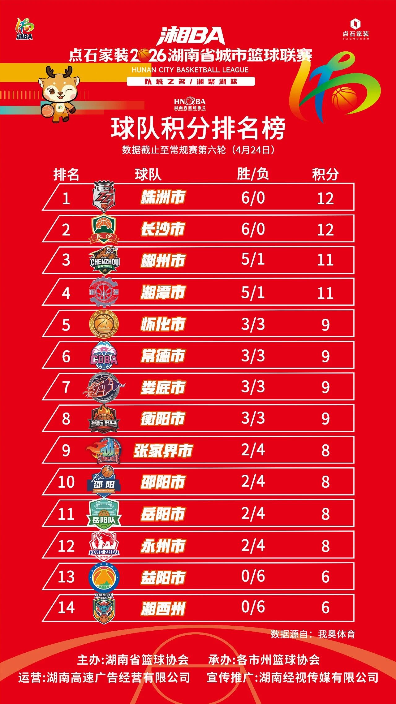 2026湖南省城市篮球联赛(湘BA)第6轮积分榜