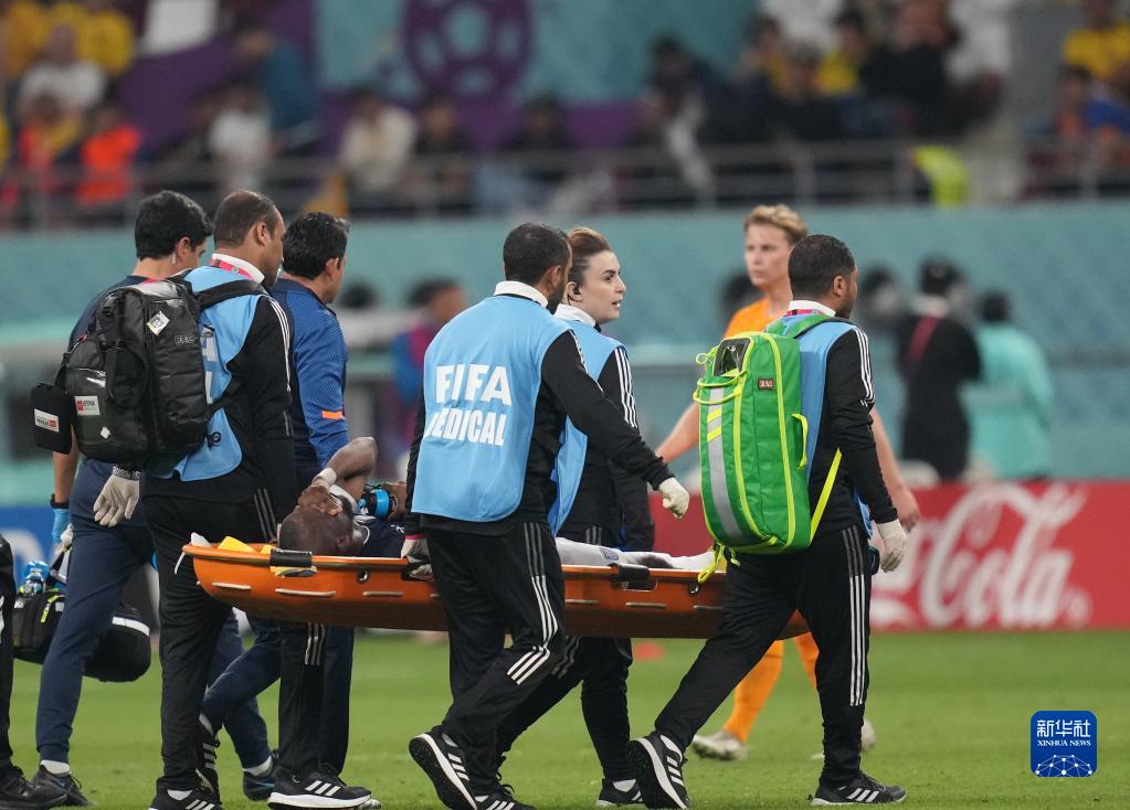 11月25日,厄瓜多尔队球员恩纳·瓦伦西亚在比赛中受伤后被抬离赛场。新华社记者 孟永民 摄