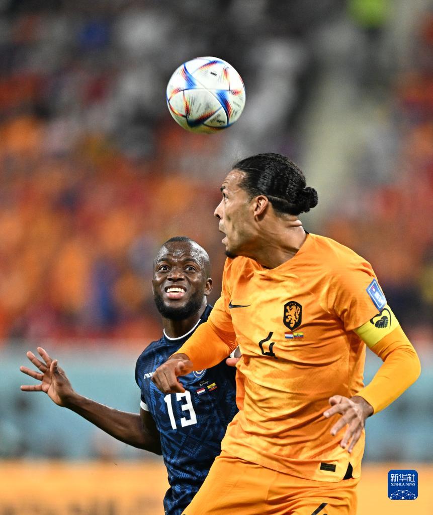 11月25日,荷兰队球员范戴克(右)与厄瓜多尔队球员恩纳·瓦伦西亚在比赛中争顶。新华社记者 辛悦卫 摄