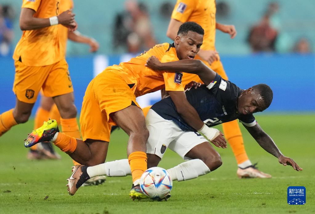 11月25日,厄瓜多尔队球员冈萨洛·普拉塔(上左)与荷兰队球员弗朗基·德容(下)在比赛中拼抢。新华社记者 李钢 摄