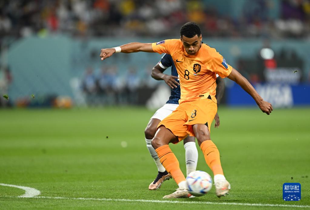 11月25日,荷兰队球员科迪·加克波(前)在比赛中射门得分。新华社记者 李尕 摄