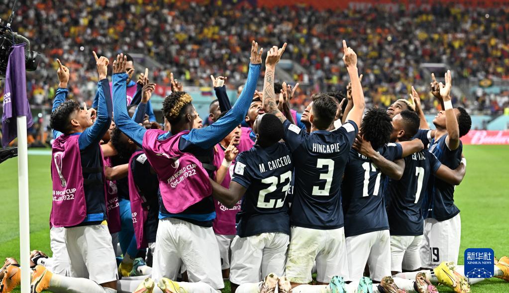 11月25日,厄瓜多尔队在比赛中庆祝进球。新华社记者 辛悦卫 摄