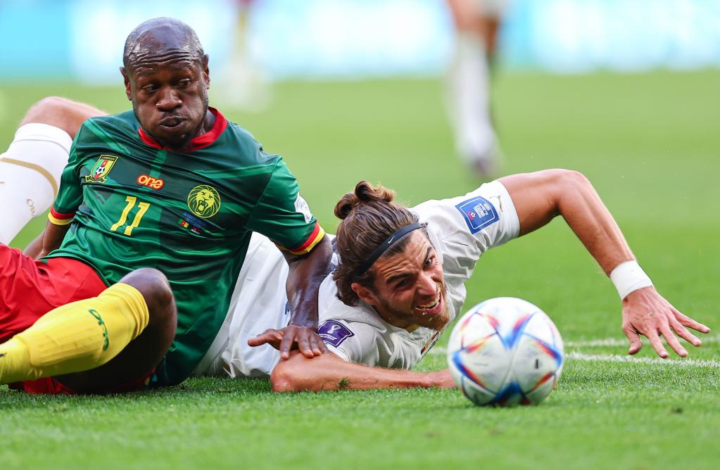 11月28日,喀麦隆队球员巴索戈(左)与塞尔维亚队球员斯尔詹·巴比奇拼抢。新华社记者 丁旭 摄