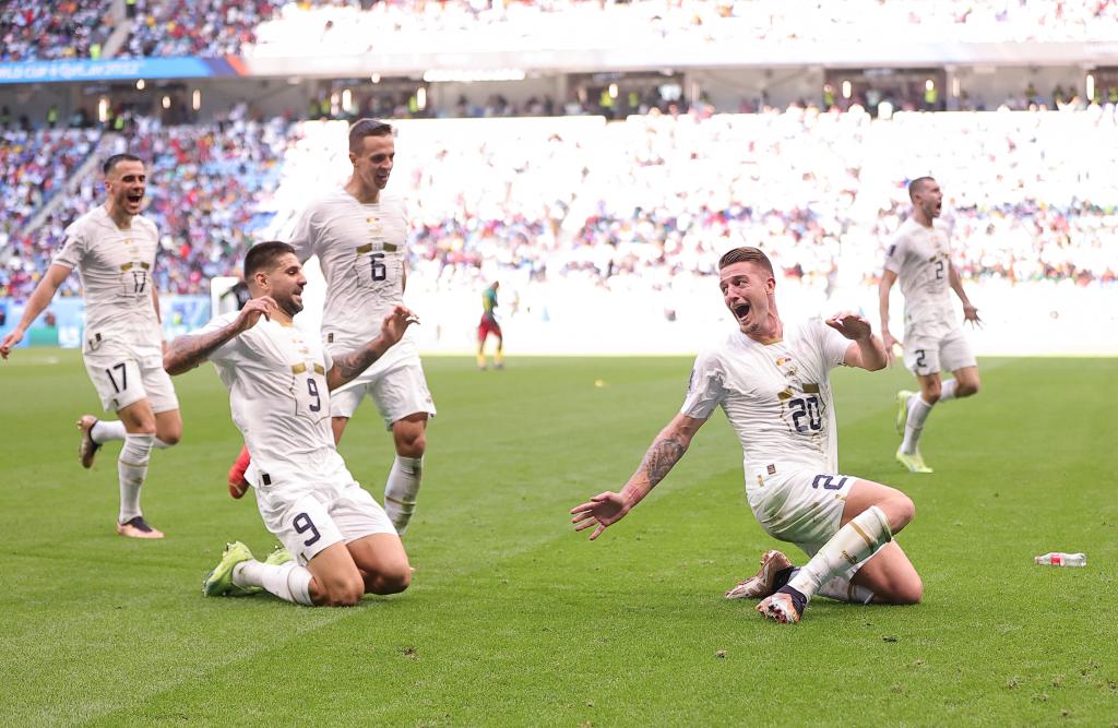 11月28日,塞尔维亚队球员谢尔盖·米林科维奇-萨维奇(前右,20号)打入球队第二粒进球后庆祝。新华社记者 王东震 摄