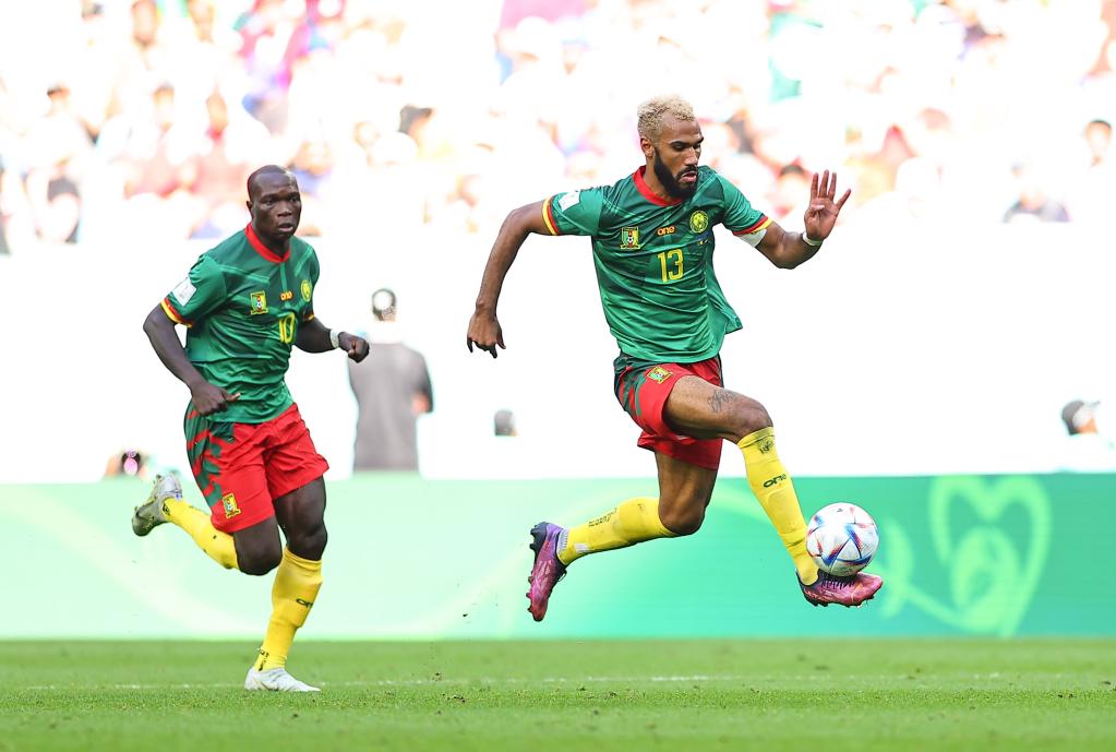 11月28日,喀麦隆队球员舒波-莫廷(右)与队友阿布巴卡尔在比赛中。新华社记者 丁旭 摄