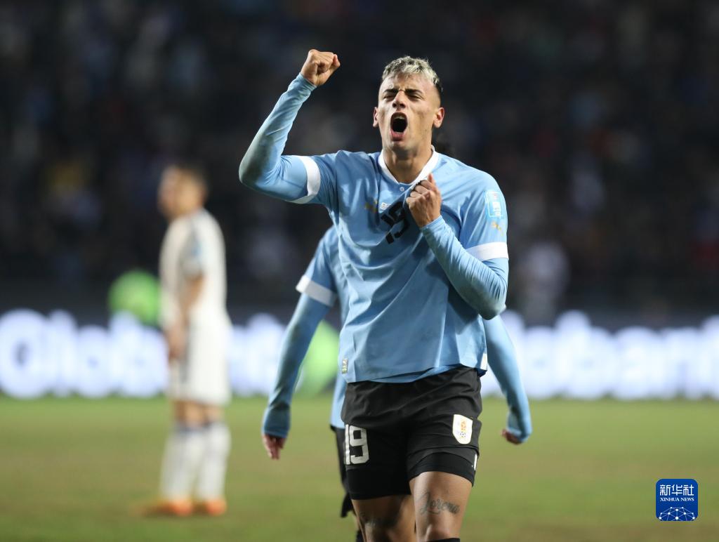 6月11日,乌拉圭队球员罗德里格斯在比赛中庆祝进球。新华社发(马丁·萨巴拉 摄)