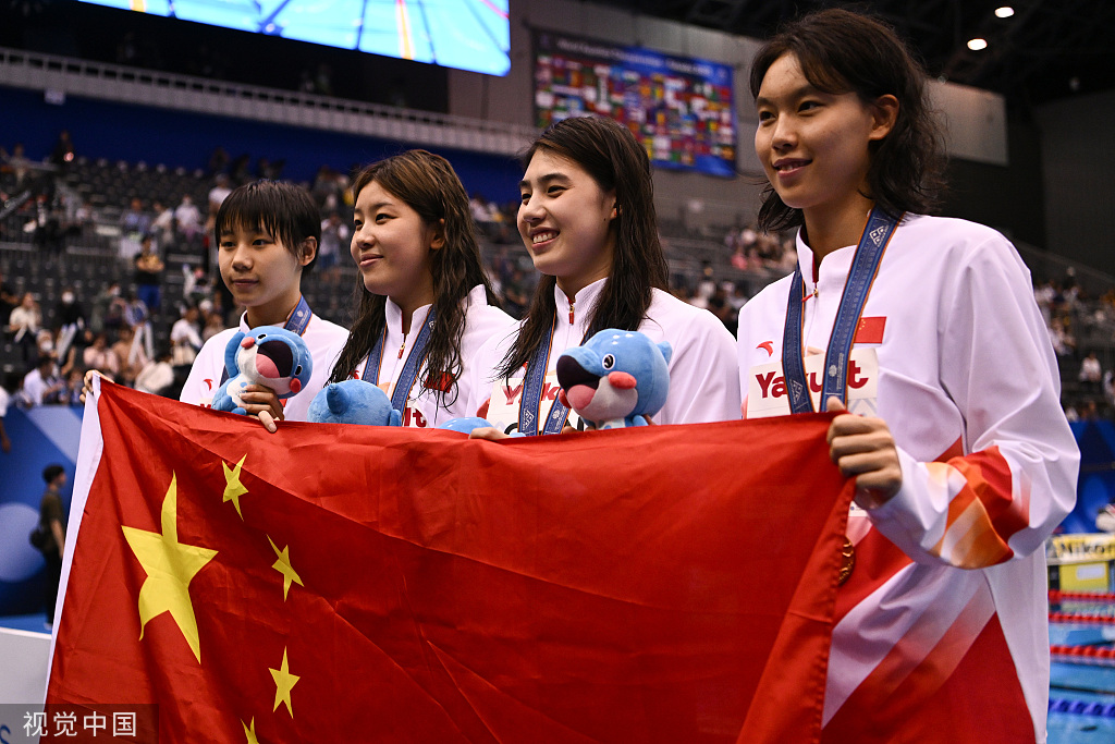 最终中国队以3分32秒40的成绩,打破亚洲纪录获得铜牌,这也是中国队本届世锦赛的第一枚奖牌。男子4×100米自由泳接力,中国队预赛时排名第五晋级。决赛中国队派出潘展乐、陈俊儿、王长浩、王浩宇四人出战。