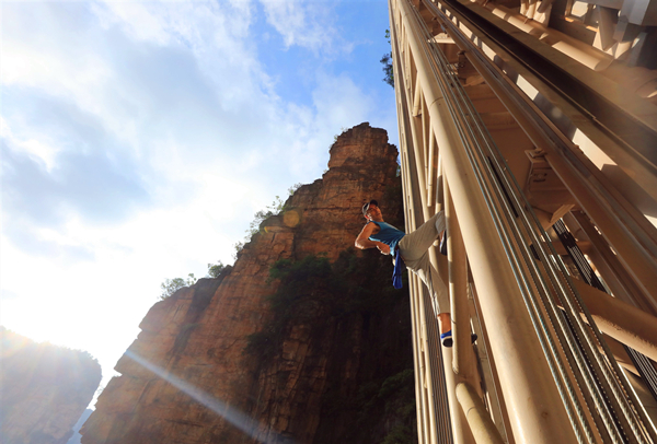 (体育)湖南张家界:法国攀岩运动员徒手攀爬百龙天梯