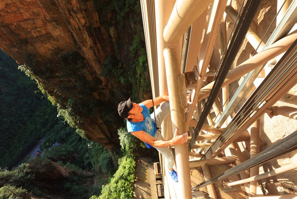 6月28日,马今在攀爬百龙天梯贴山钢结构井架。