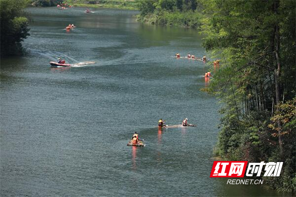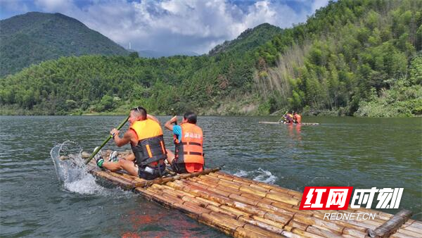 宽阔的湖面上,选手需要分工协作,利用竹筏到达对岸。竹筏项目不是只凭借力量,还要掌握规律和节奏。很多选手划到对岸还意犹未尽,“虽然很少接触竹筏,但是在青山绿水中划船,加上大家都相互加油鼓劲,非常激动,非常开心!”一位运动员赛后还兴奋地说道。
