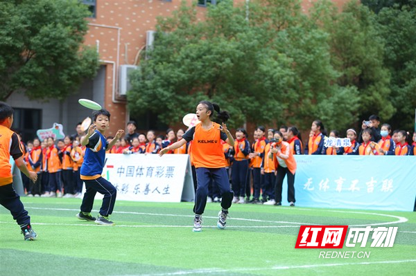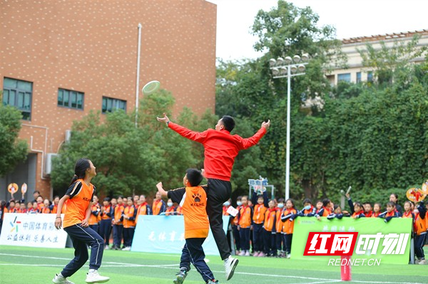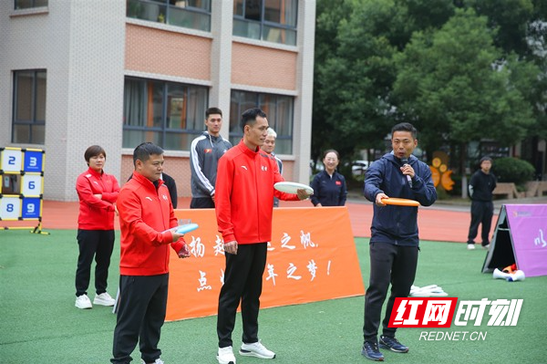 飞盘是近些年人气十足的群众性体育项目,也广受青少年们的喜爱。在学校操场,同学们正在进行飞盘训练。体育湘军来到操场后,受到了操场上师生们的热烈欢迎,奥运冠军龙清泉、世界冠军董斌更是直接参与其中,与同学们共同体验了一节飞盘训练课,进行了一场飞盘公开比赛。