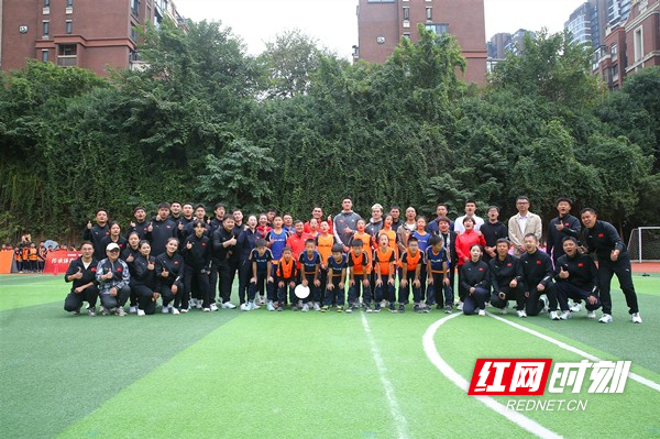 参加飞盘活动的学生、教练和工作人员与体育湘军合影。