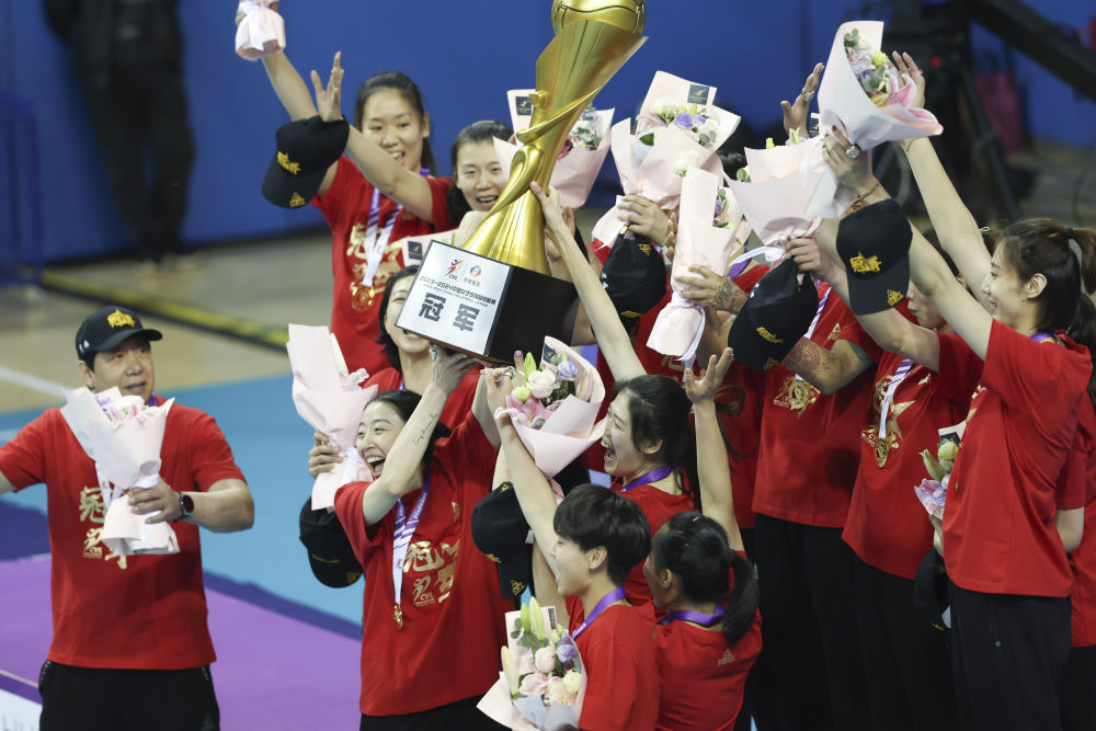 2月3日,天津队在颁奖仪式上高举冠军奖杯庆祝。新华社发(海沙尔摄)