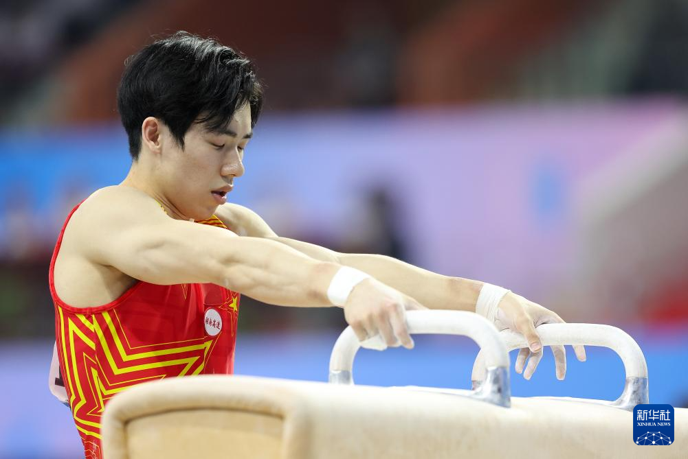 4月26日,湖南队选手张博恒在鞍马项目比赛中。最终,他因伤退赛。新华社记者 曹灿 摄