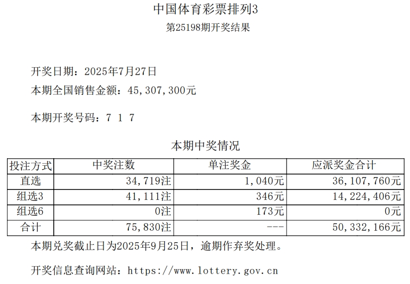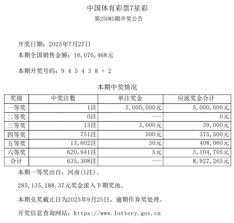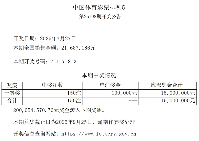 中国体育彩票2025年7月27日开奖信息