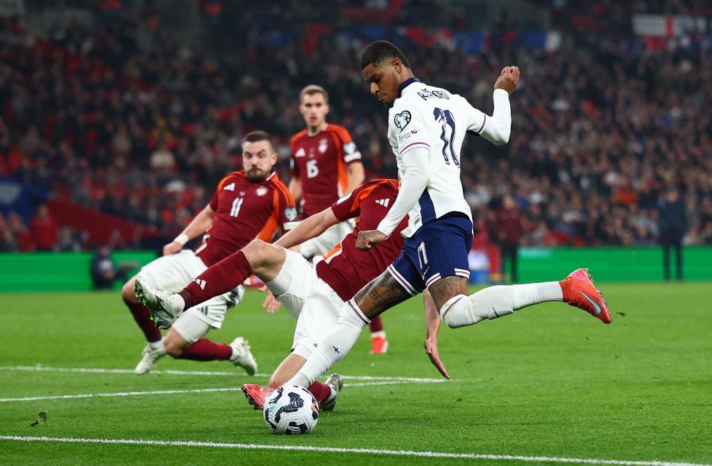 3月24日,英格兰队球员拉什福德(右)在比赛中射门。当日,在英国伦敦举行的2026年美加墨世界杯欧洲区预选赛小组赛中,英格兰队3比0战胜拉脱维亚队。新华社/路透