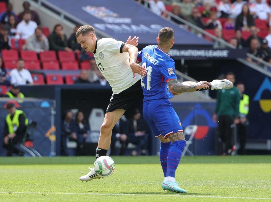资料图:德国队球员维尔茨(左)在比赛中拼抢。新华社发(菲利普·鲁伊兹摄)