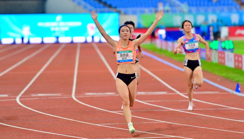 8月11日,浙江队选手陈妤颉(前)在冲线后庆祝。新华社记者 吴青昊 摄