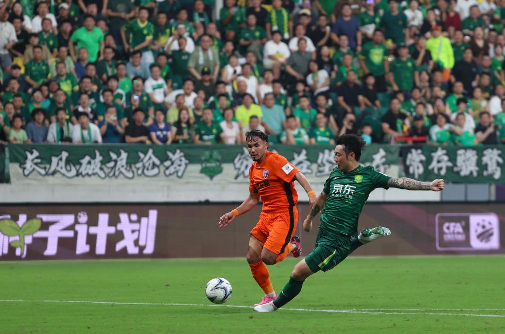 8月20日,北京国安队球员张稀哲(右)在比赛中射门。新华社记者 胡星宇 摄