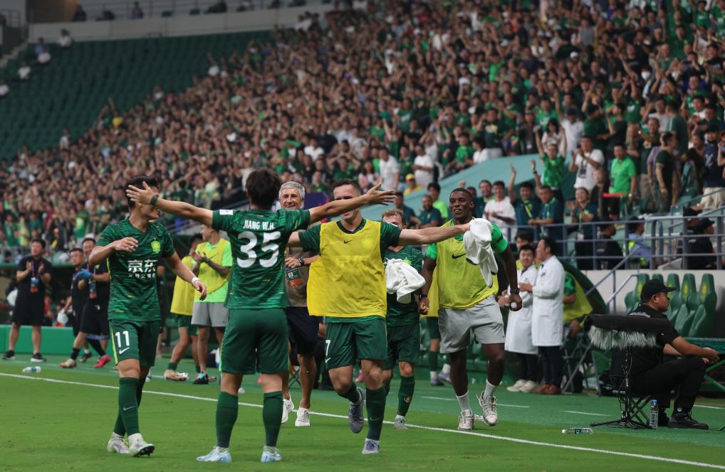 8月20日,北京国安队球员江文豪(左二)在比赛中进球后庆祝。新华社记者 胡星宇 摄