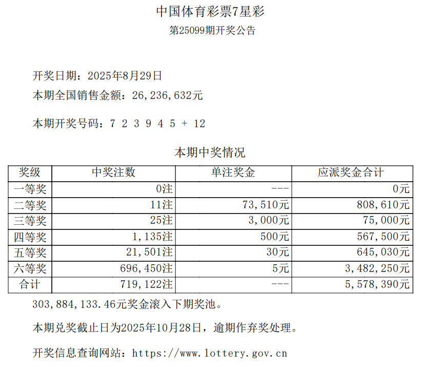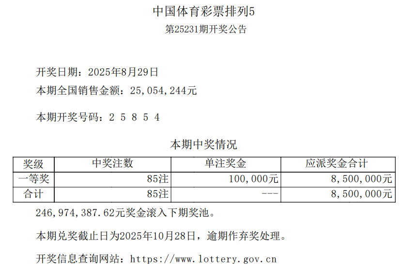 中国体育彩票2025年8月29日开奖信息