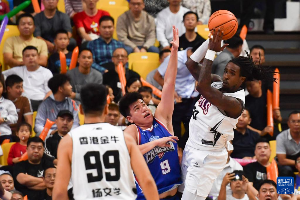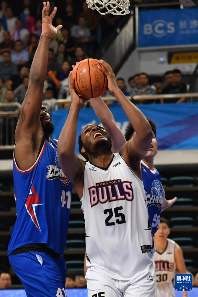 9月22日,香港金牛队球员凯文·克罗斯(右)与长沙电信勇胜队球员刘佳鑫在比赛中拼抢。