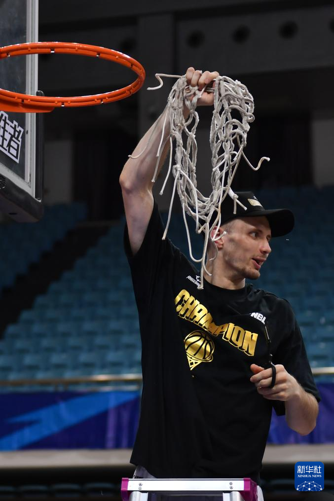 9月22日,香港金牛队球员迈克尔·厄特尔二世在赛后剪下篮网庆祝。