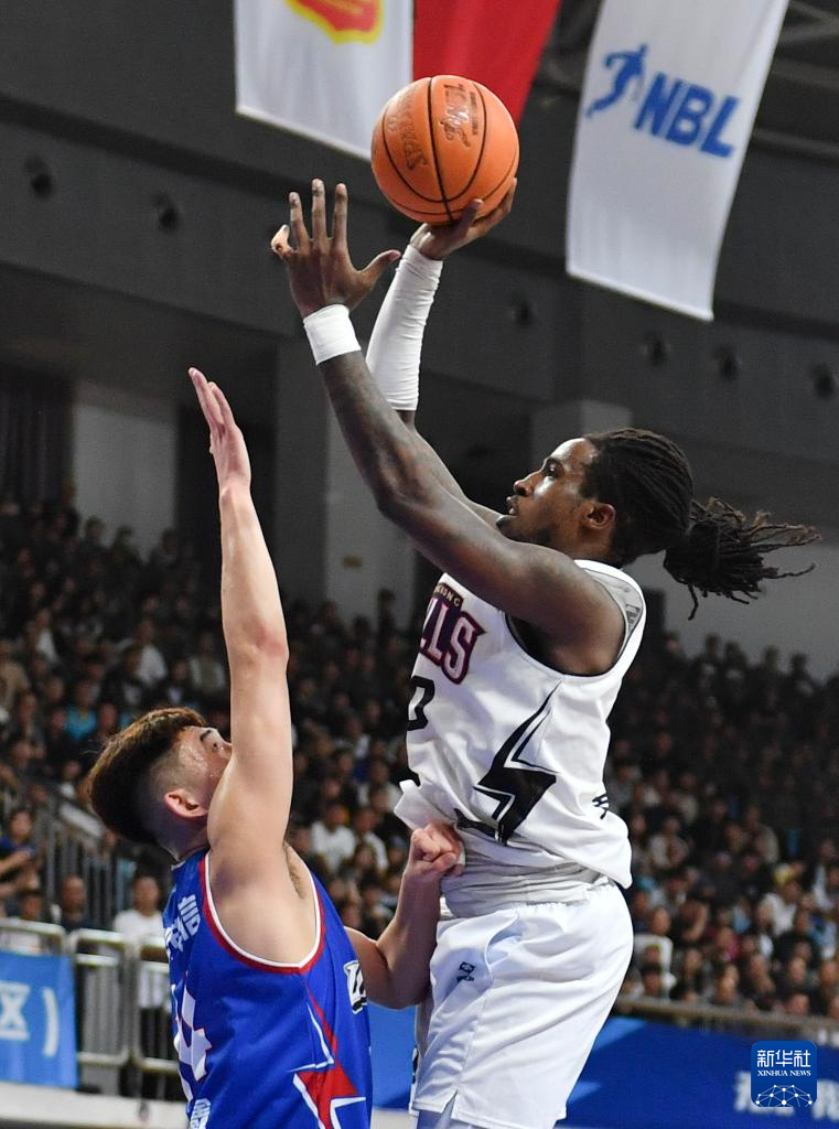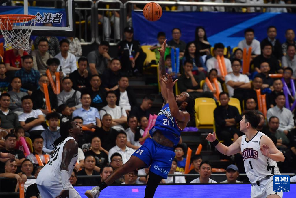 9月22日,长沙电信勇胜队球员德兹明·威尔斯(中)在比赛中投篮。