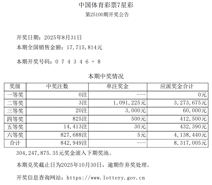 中国体育彩票2025年8月31日开奖信息