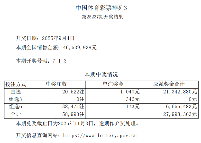中国体育彩票2025年9月4日开奖信息