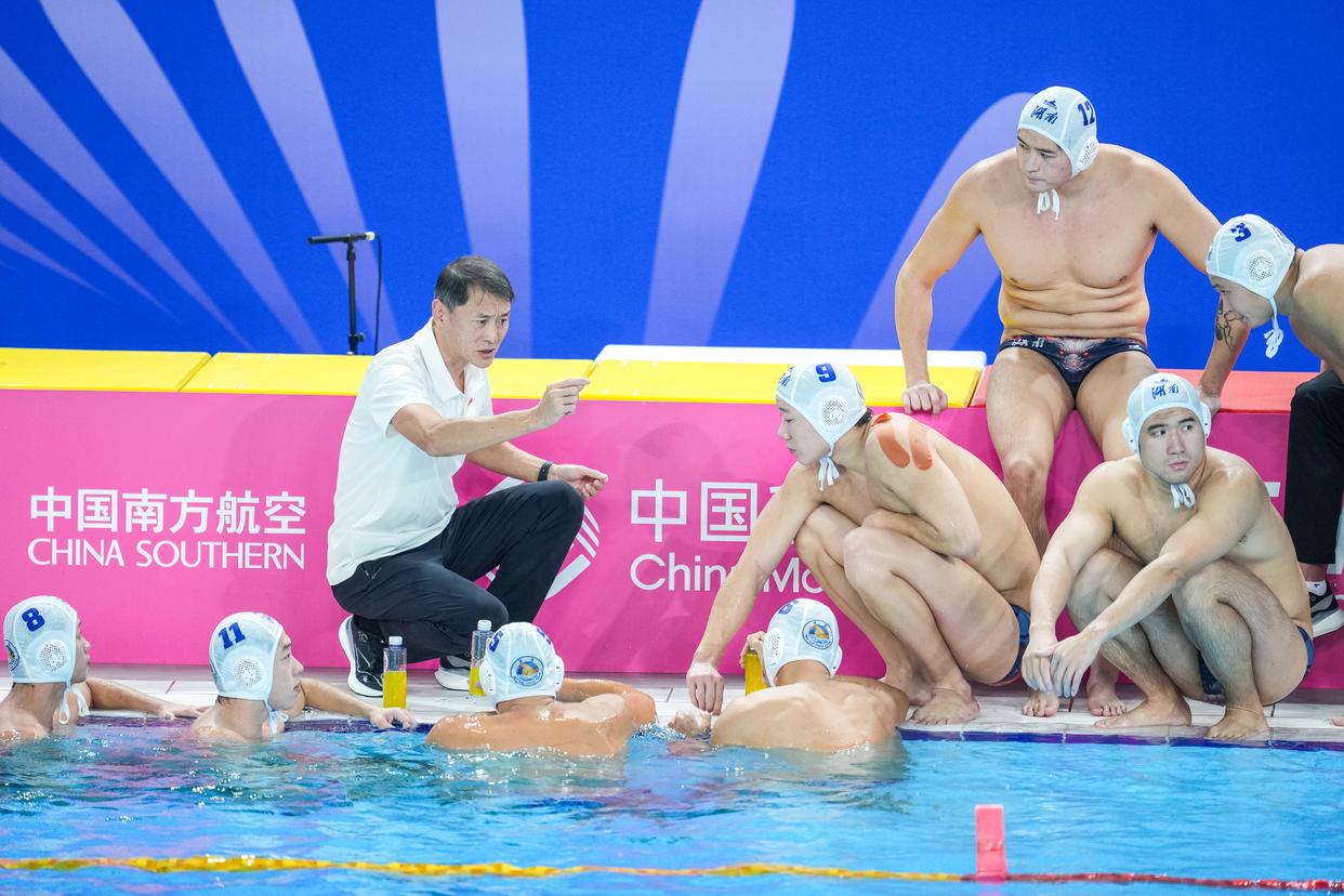 10月25日,湖南队主教练龚大立(上左一)在比赛间隙布置战术。新华社记者 陈思汗 摄